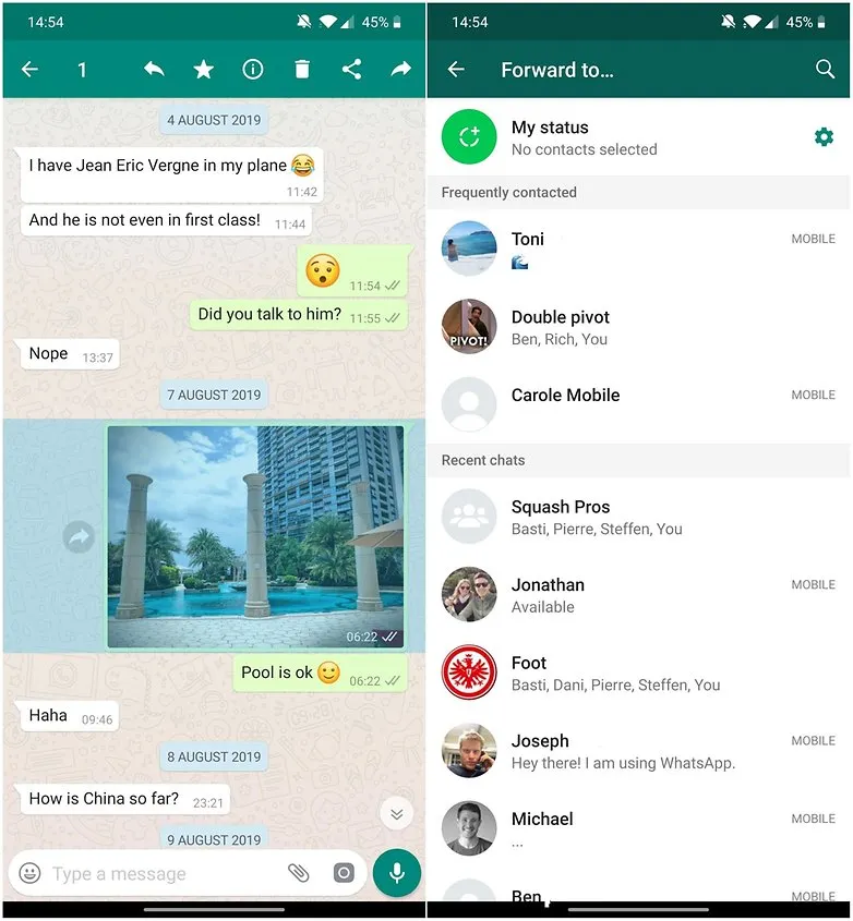 . Cara melakukannya telah berubah. Tekan lama pada gambar dalam obrolan yang ingin Anda bagikan, dan di kanan atas halaman, panah menghadap ke kanan akan muncul. Tekan ini, dan Anda dapat memilih kontak yang ingin Anda bagikan gambar.