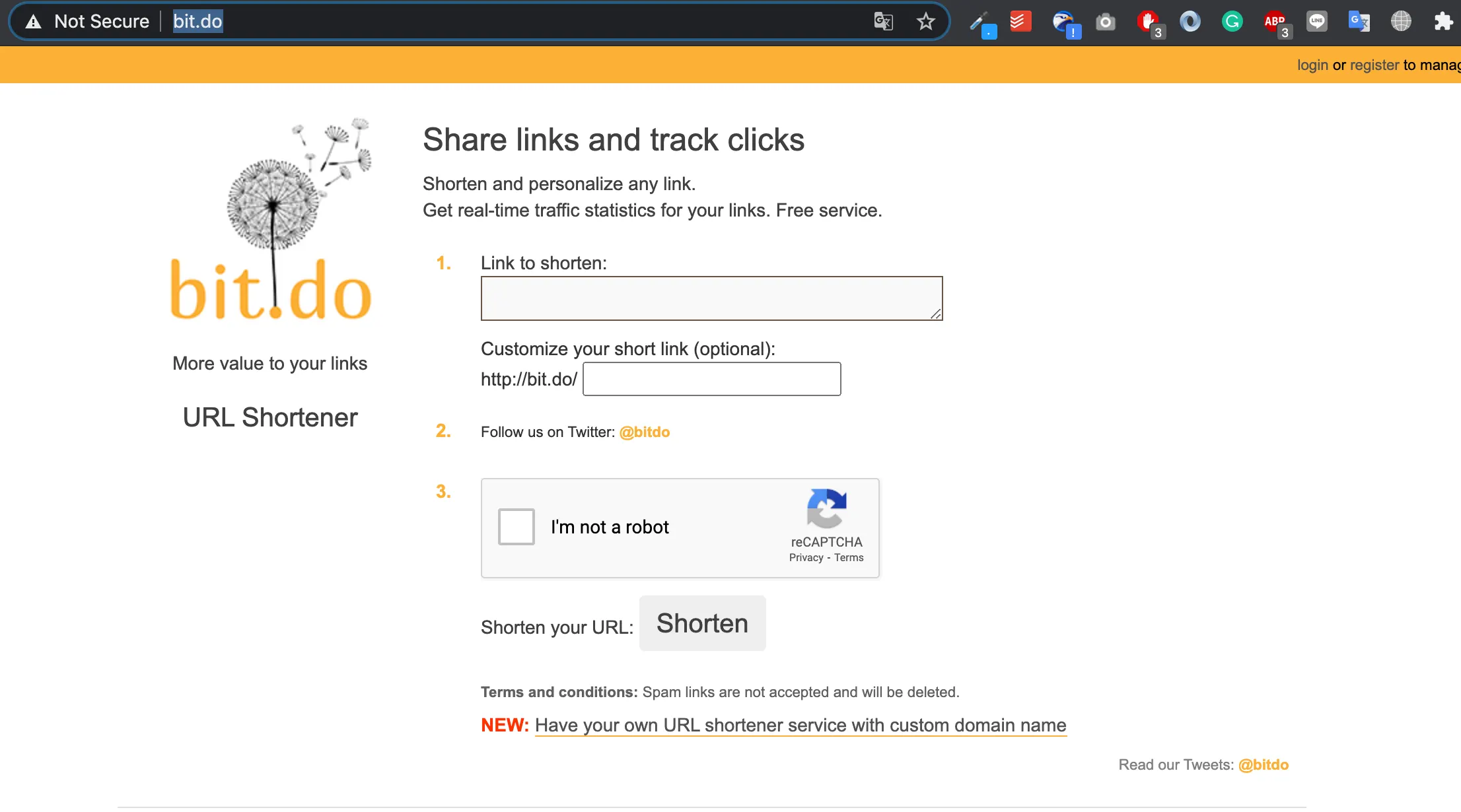 Mirip dengan Is.gd, aplikasi pemendek tautan Bit.do juga sangat simpel. Kamu bisa menyingkat link di Bit.do dengan atau tanpa akun terdaftar.