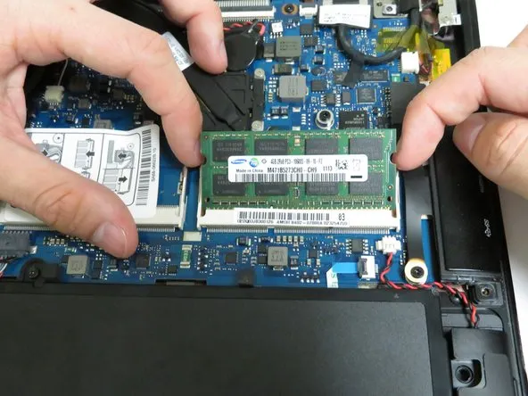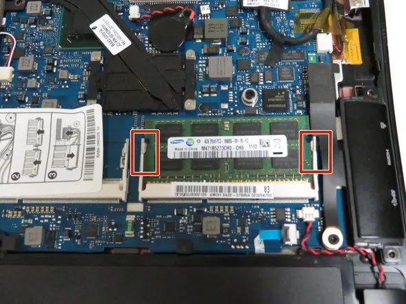 Lanjutkan proses pasang RAM dengan menekan bagian RAM ke kunci RAM. Pastikan kedua kunci RAM mengeluarkan bunyi "Klik" dan terpasang dengan baik. Pastikan juga tidak keras atau tidak ada bagian mengganjal.