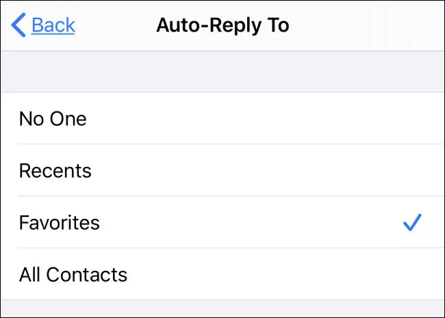Ada beberapa pilihan antara lain: No One (fitur Auto Reply akan secara otomatis akan dimatikan), Recent (orang terakhir yang dihubungi), Favorites (kontak yang sudah ditandai Favorite), atau Seluruh Kontak.