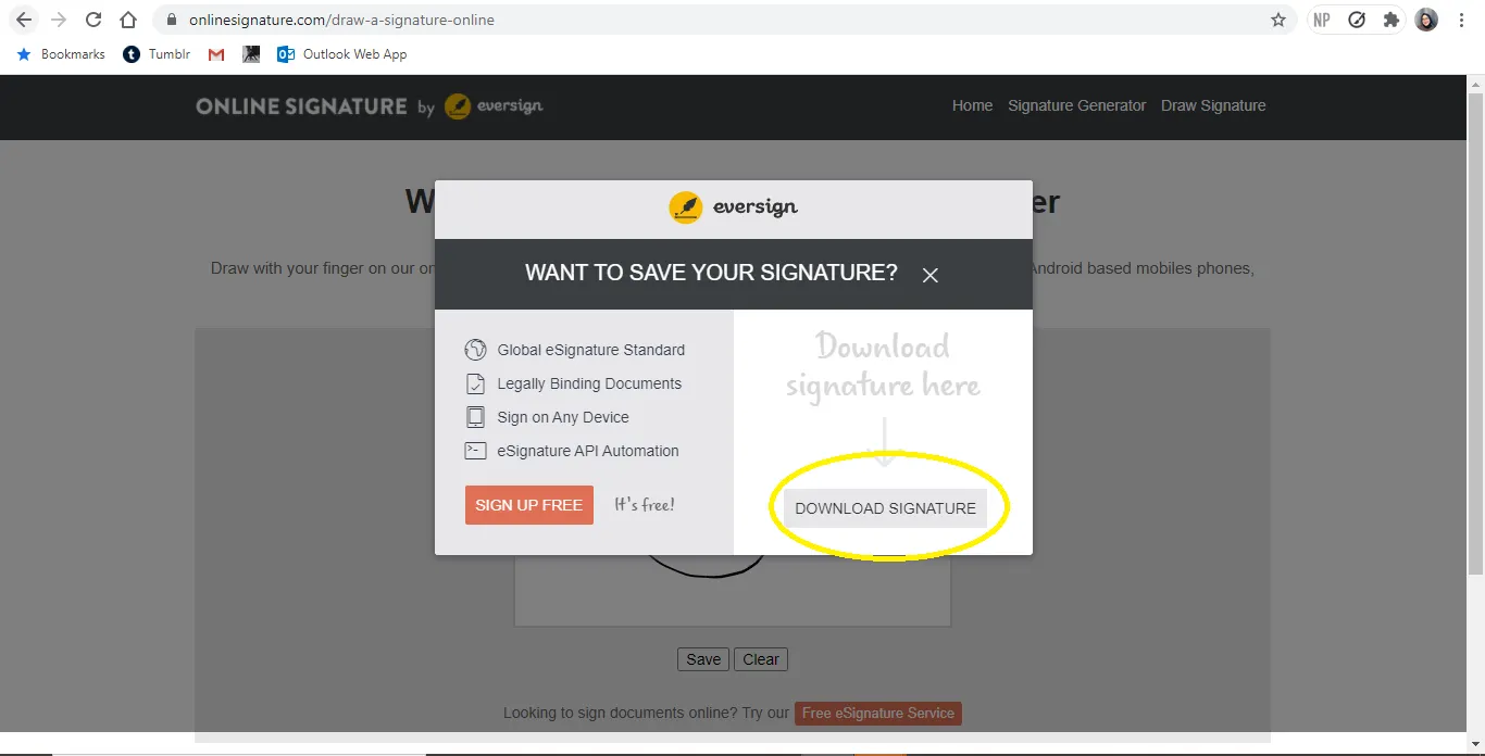 Setelah menggambar pada kolom yang tersedia, kamu dapat menyimpannya dengan mengklik tombol Save atau menghapusnya dengan tombol Clear. Jika mengklik tombol Save, akan muncul pilihan Download Signature seperti di bawah ini. Tanda tangan yang kamu unduh, otomatis akan tersimpan di folder perangkat yang kamu gunakan.