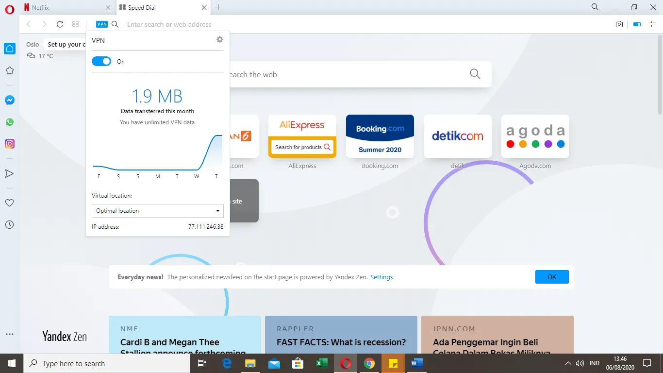 Lalu, aktifkan VPN yang tersedia di kiri atas tab Search pada Opera Browser. Perlu diingat, VPN di sini merupakan bawaan dari Opera Browser yang tinggal kamu atur pemakaiannya. Jadi tidak diperlukan aplikasi tambahan, ya.