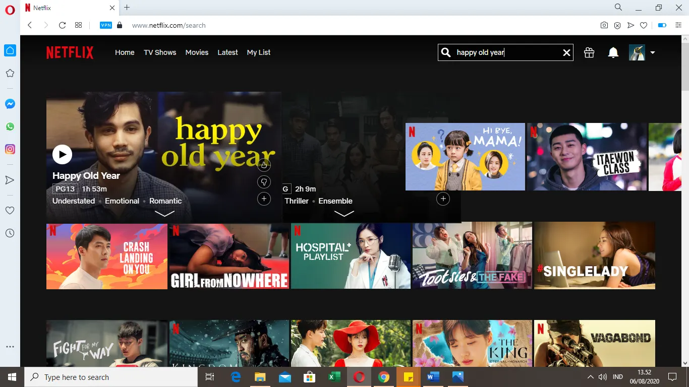 Karena tujuan kita menggunakan Opera Browser untuk menonton film/serial yang belum tayang di Netflix Indonesia, maka dari itu pencarian kali ini adalah film Thailand berjudul Happy Old Year.
