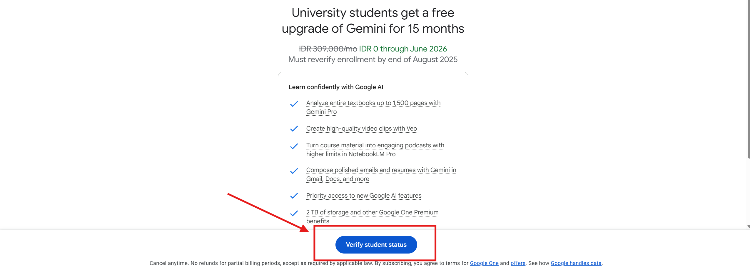 Google memberikan penawaran spesial bagi pengguna akun pelajar. Jika kamu memiliki email institusi pendidikan seperti “@ui.ac.id” atau “@itb.ac.id”, kamu bisa menikmati Google AI Pro secara cuma-cuma selama 15 bulan! Ini tentunya membuka peluang besar bagi mahasiswa dan pelajar yang ingin eksplorasi teknologi AI video tanpa harus merogoh kocek dalam-dalam.