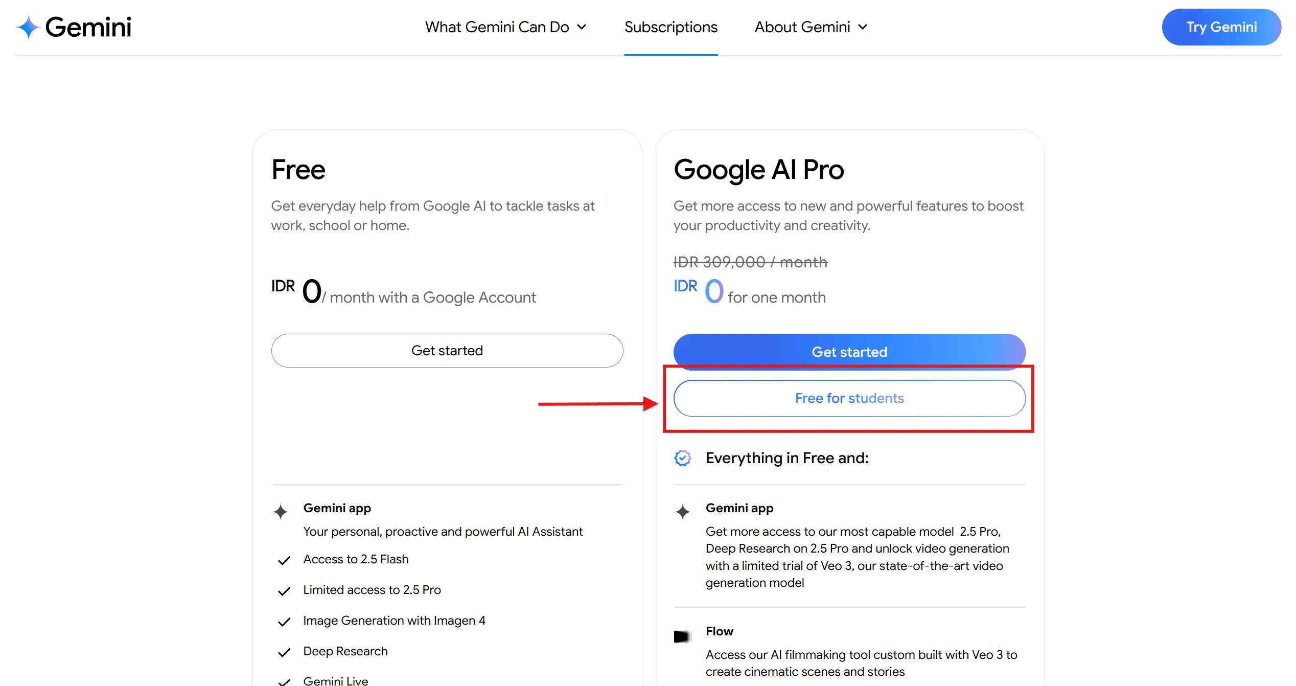 Di halaman langganan, pilih opsi “Free for Student”.
