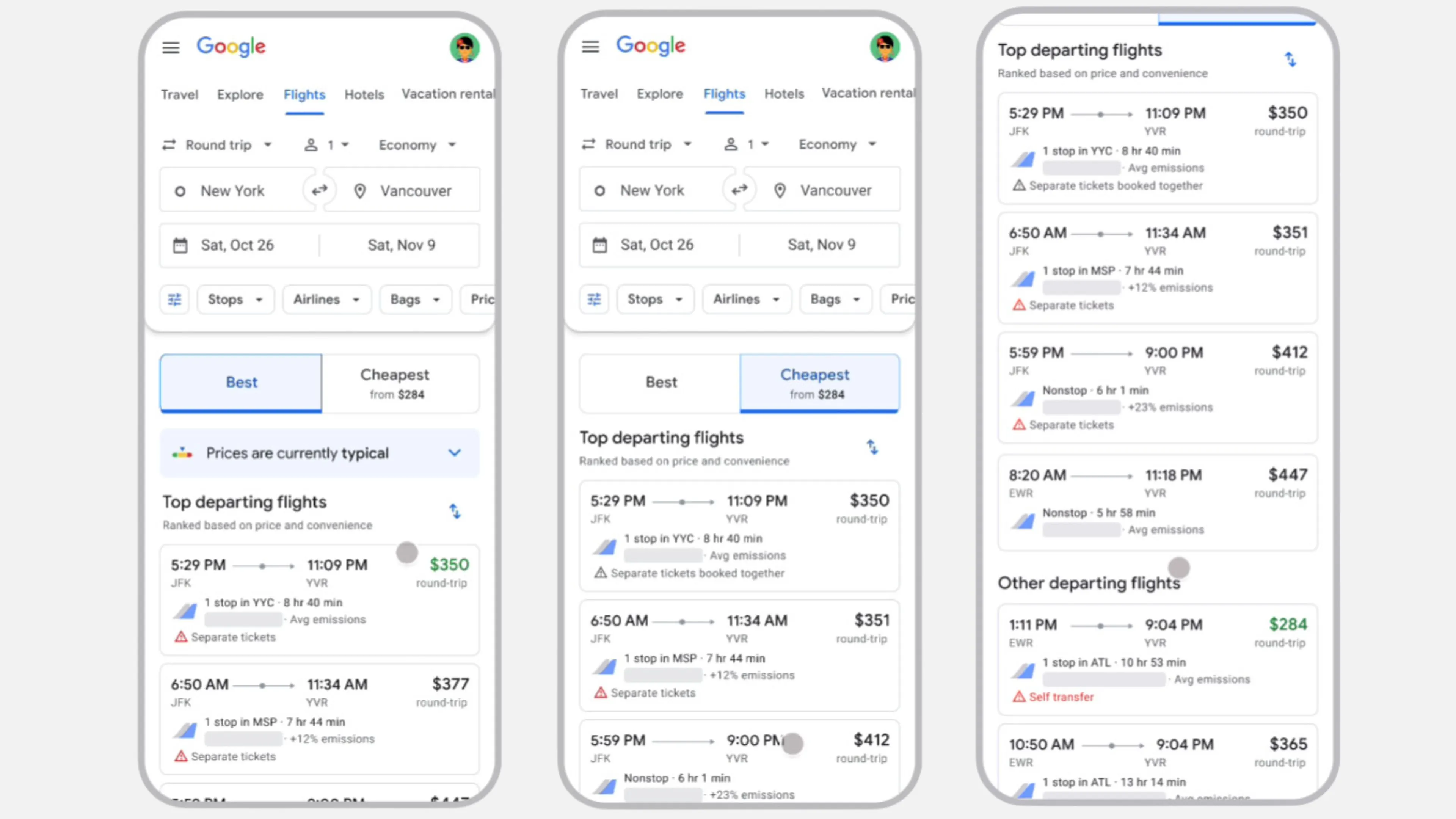 Saat pengguna mencari tiket pesawat di Google Flights, opsi terbaik akan muncul di bagian atas hasil pencarian. Opsi ini didasari pada penggabungan harga dan kenyamanan.