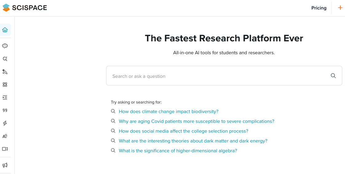 Sebagai asisten penelitian, SciSpace memiliki banyak fitur yang menjadi keunggulannya dibandingkan website AI lainnya. Bahkan, SciSpace memiliki klaim sebagai mesin pencari untuk penelitian nomor satu. Terdapat 282 juta karya ilmiah dalam database nya yang memudahkan pengguna mencari referensi untuk skripsi atau karya tulis lainnya. beberapa fitur unggulan SciSpace diantaranya kajian literatur yang efisien, analisis literatur, pencarian dengan pertanyaan, mendeteksi konten AI, eksistensi peramban, sitasi otomatis, notebook, hingga paraphrase.