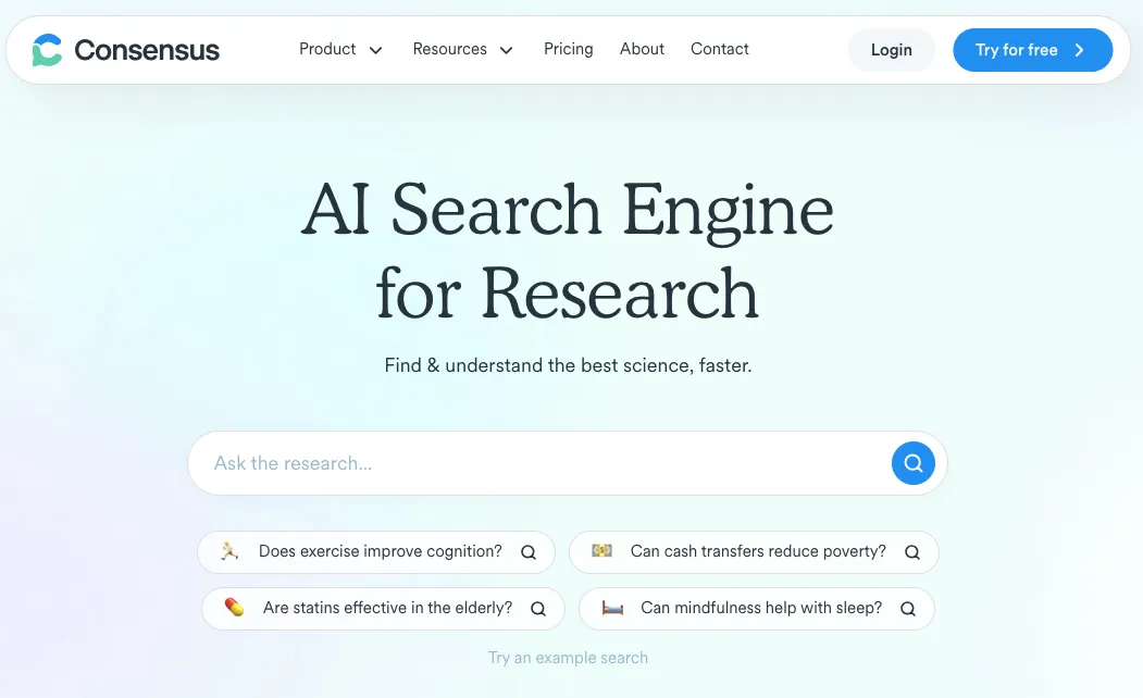 Salah satu website AI yang bisa membantu kamu dalam mencari referensi yaitu Consensus. Kamu hanya perlu mengajukan pertanyaan dan Consensus akan menjawab dengan memberikan beberapa artikel, jurnal, hingga buku sebagai referensinya. Selain itu, consensus juga bisa meringkas pembahasan referensi yang ditemukan. Dengan memiliki lebih dari 200 juta publikasi ilmiah, website Consensus akan membuat kamu lebih mudah menemukan referensi yang sesuai dengan topik skripsi yang akan kamu kerjakan.