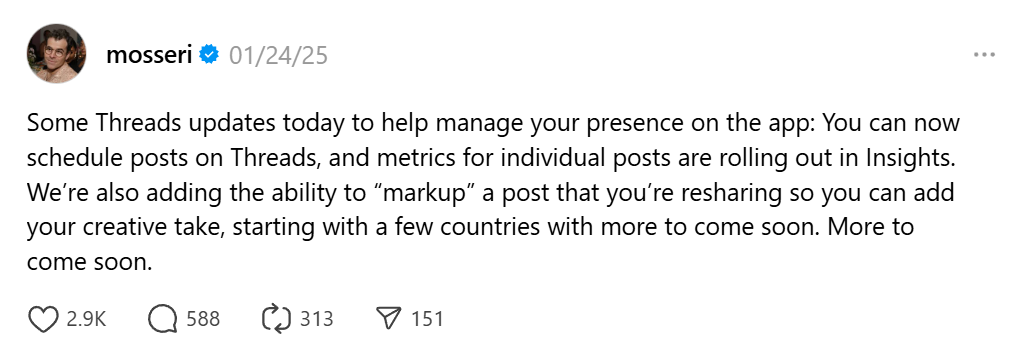 Menyadari pentingnya kemudahan bagi pengguna dalam mengelola kehadiran digital mereka, Mosseri juga membagikan kabar terbaru melalui platform Threads. Saat ini, pengguna sudah mulai dapat menggunakan fitur penjadwalan postingan (scheduling) secara langsung. Selain itu, metrik untuk postingan individu kini mulai digulirkan dalam fitur Insights untuk membantu pengguna memantau performa dengan lebih mendalam.