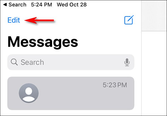 Pertama, buka aplikasi “Messages.” Pada iPhone, lihat ke sudut kanan atas layar dan ketuk tombol elips yang terlihat seperti tiga titik dalam lingkaran. (Pada iPad, tombolnya sedikit berbeda, seperti yang terlihat pada gambar di bawah ini).