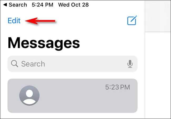 Pertama, buka aplikasi “Messages.” Pada iPhone, lihat ke sudut kanan atas layar dan ketuk tombol elips yang terlihat seperti tiga titik dalam lingkaran. (Pada iPad, tombolnya sedikit berbeda, seperti yang terlihat pada gambar di bawah ini).
