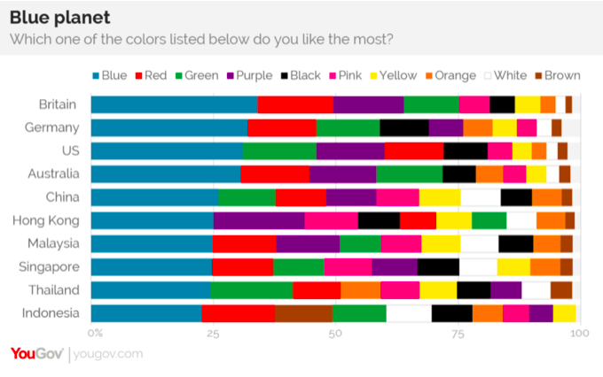 - Terkait dengan alam. Biru sangat terkait dengan air bersih, langit cerah, dll, yang mengarah ke preferensi tinggi sebagai warna.