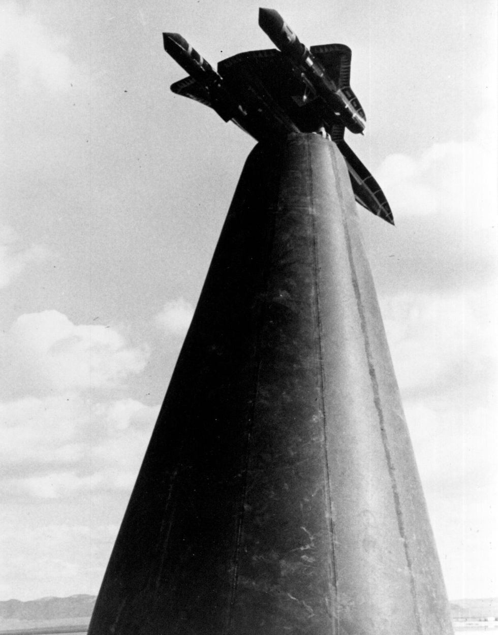 “Ini adalah mock-up A-12 skala penuh dalam konfigurasi eksternal dengan semua kemudi yang bergerak pada sirip tiang. Sebuah piston ram yang diaktifkan mengangkat tiang yang terdiri dari tiga poros baling-baling kapal perang hingga 50 kaki dengan kepala berputar untuk mengubah tampilannya."