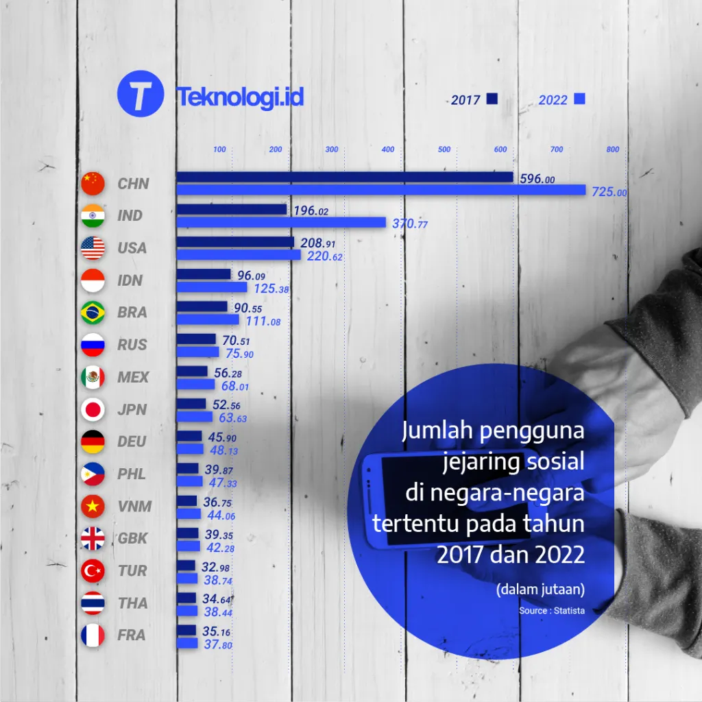 Bagan ini menggambarkan jumlah pengguna jejaring sosial yang diproyeksikan pada tahun 2017 dan 2022 di negara-negara terpilih. Melalui bagan ini terlihat bahwa angka pengguna internet di China mendekati 725 juta pada tahun 2022, naik dari 596 juta pengguna jejaring sosial pada tahun 2017.