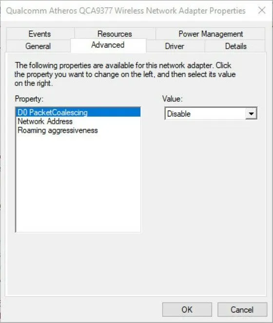 - Klik tab advance dan ganti value menjadi disabled. Setelah itu restart laptop dan coba koneksikan ke jaringan Wi-Fi yang tersedia.