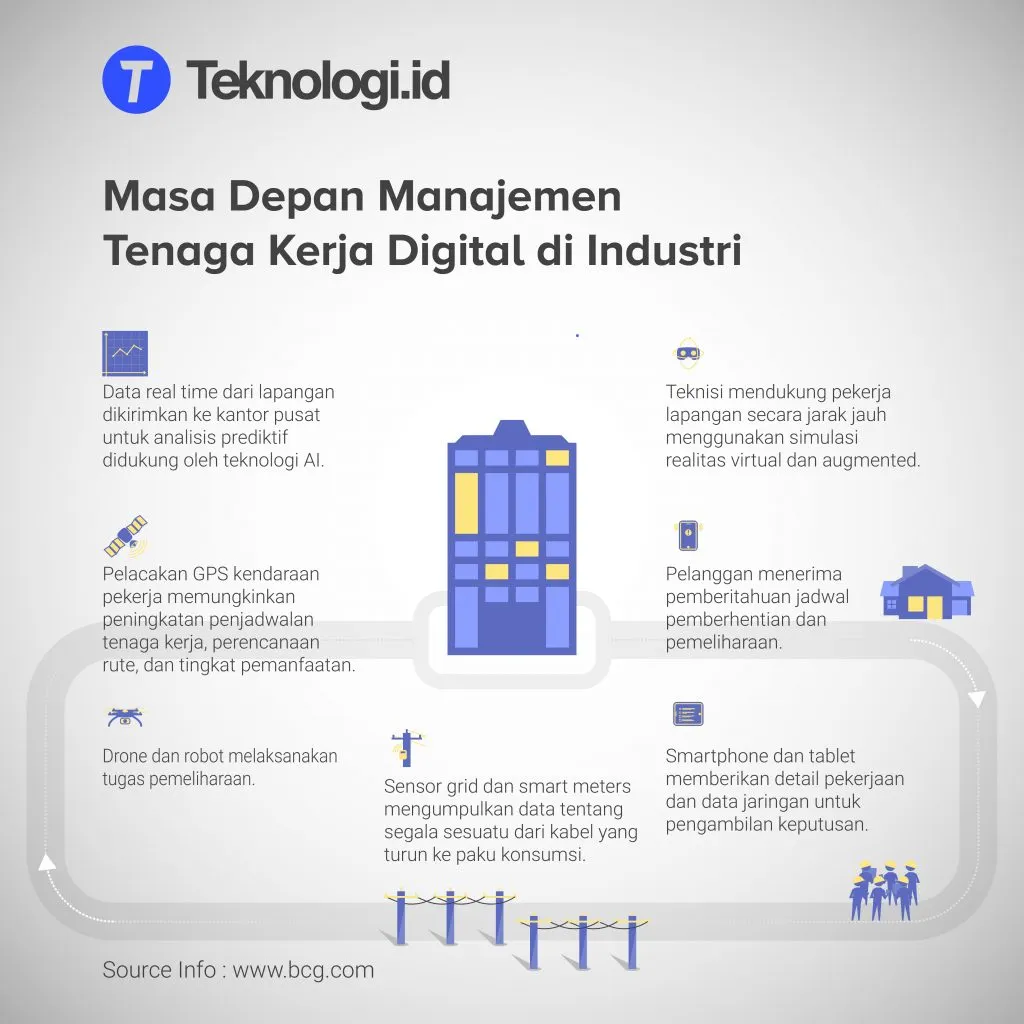 Penggunaan manajemen tenaga kerja digital di lapangan meningkatkan efisiensi utilitas dan menurunkan biaya, tahap akhir ini perusahaan membutuhkan lebih sedikit orang untuk melakukan tugas. Kegiatan pengawasan dan pengecekan jaringan listrik atau jaringan pipa gas dengan robot atau drone dan menggunakan alarm yang memberikan sinyal ketika bagian sistem mengalami kondisi di luar normal. Data real-time yang didapatkan memungkinkan perusahaan mengambil keputusan investasi yang lebih baik tentang pemeliharaan dan penggantian peralatan.