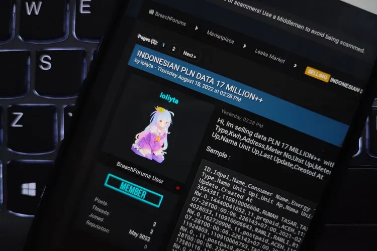 Seorang pengguna Breached Forums, 'loliyta', menjual belasan juta data ID pelanggan, nama konsumen, alamat konsumen, serta informasi tipe energi dan besarnya penggunaan listrik dari data PLN.