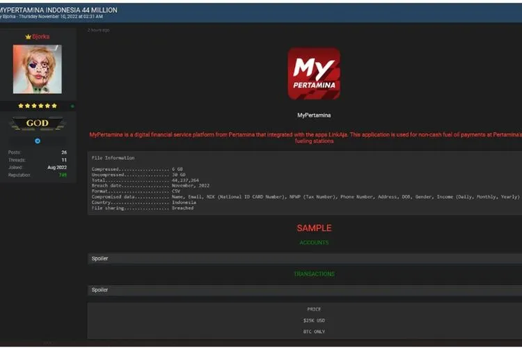 Melalui Breached Forums, lagi-lagi 'Bjorka' kembali mengunggah 44,2 juta data pengguna aplikasi MyPertamina. Mulai dari nama, e-mail, nomor NPWP, nomor telepon, alamat, DOB, gender, hingga pendapatan beredar bebas di Breached Forums. Namun kebocoran data ini masih belum bisa dipastikan kebenarannya, hal tersebut dikarenakan PT Pertamina masih melakukan investigasi secara internal.