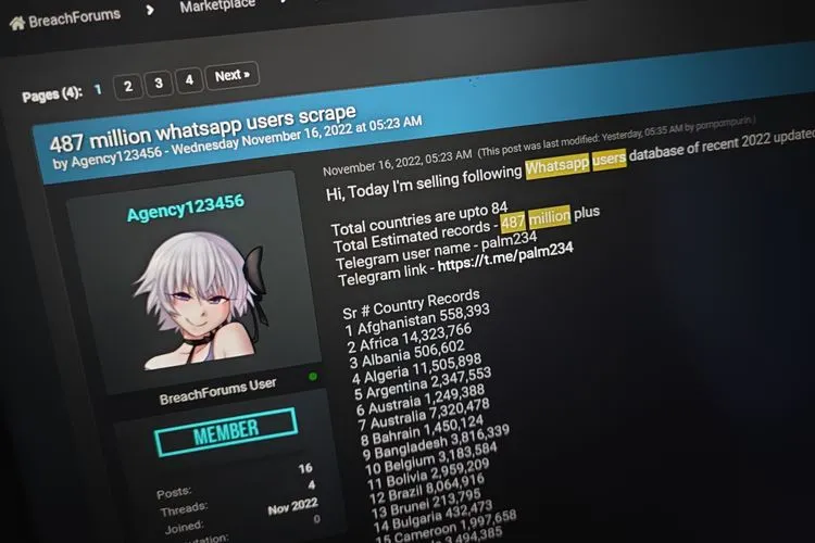 Dilakukan oleh pengguna Breached Forums dengan nama 'Agency123456', sebanyak 487 juta data pengguna WhatsApp dari berbagai negara diperjualbelikan. Diantara data-data tersebut terdapat 130.000 nomor telepon pengguna WhatsApp dari Indonesia.
