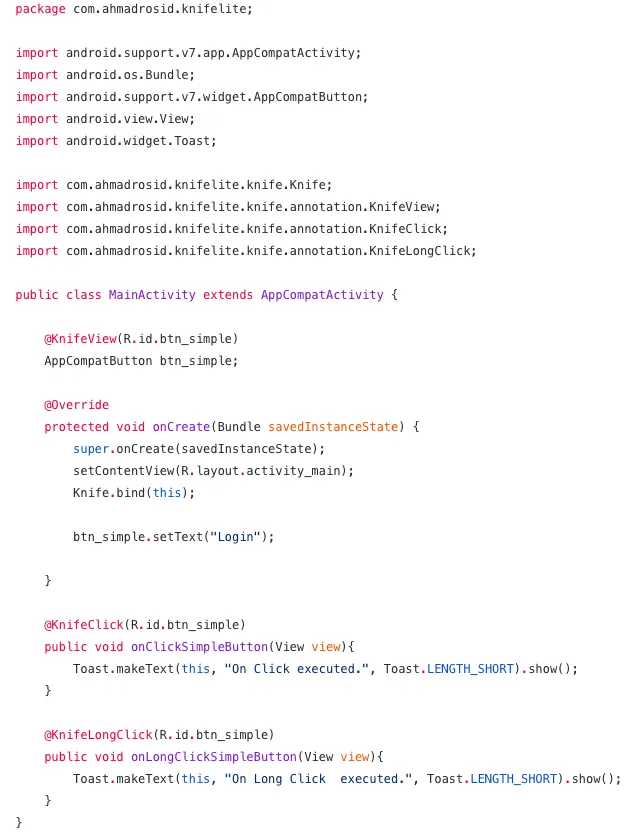 Pada method createOnClick kita akan melakukan hal yang sama untuk pertamakalinya yaitu melakukan loop pada variable mthods untuk mendapatkan method yang mengandung Annotation Interface KnifeClick. Setelah mendapatnya maka melakukan findview kembali sehingga selanjutnya kita melakukan setOnclickLitener pada view nya, dan di dalam callback click listenernya kita melakukan set accesible terhadap method yang mengandung KnifeClick tadi dan selanjutnya melakukan invoke atau memanggil method dengan memberikan parameter view.