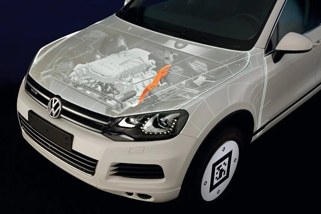 Volkswagen menggunakan augmented reality untuk memvisualisasikan dan membangun body mobil, struktur dan tata letak mesin secara digital. Insinyur dapat membandingkan maket untuk melihat apakah desain mereka sudah layak.