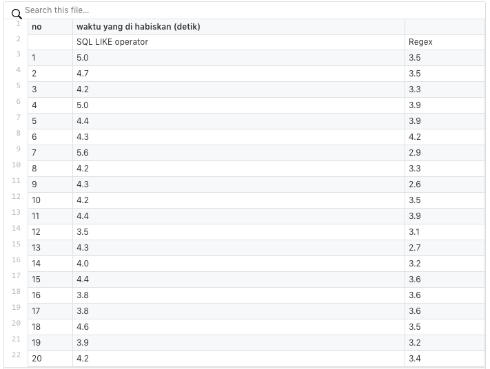 - Rata-rata waktu yang di habiskan pada query metode SQL LIKE operator adalah 4.3 detik sedangkan menggunakan Regex dihabiskan 3.42 detik.