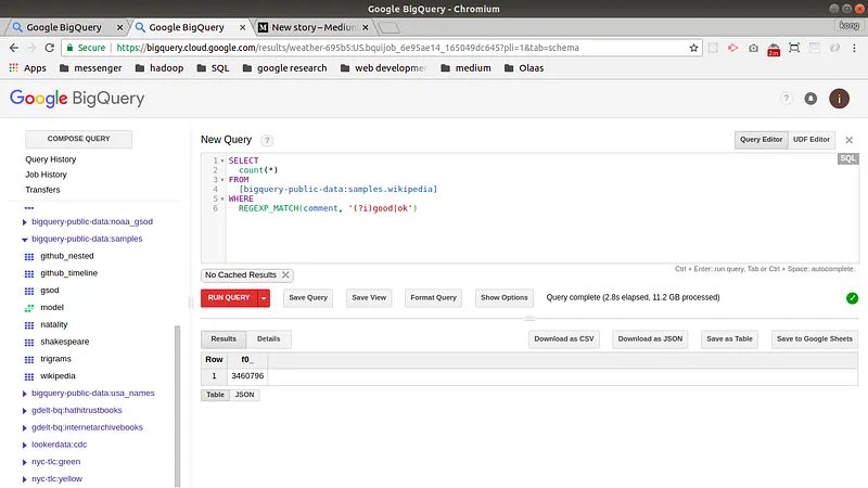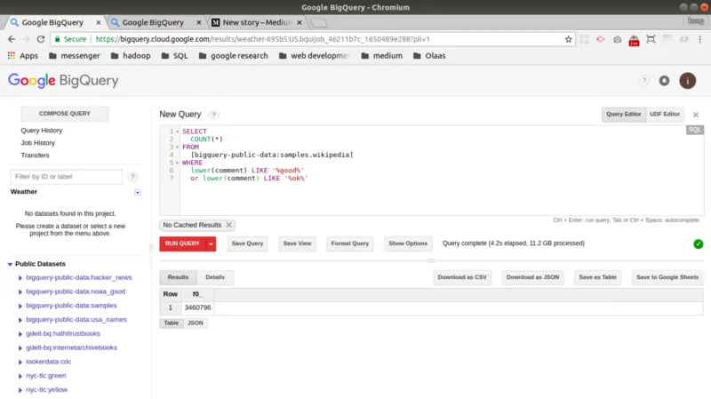 SELECT COUNT(*) FROM [bigquery-public-data:samples.wikipedia] WHERE lower(comment) LIKE '%good%' or lower(comment) LIKE '%ok%'