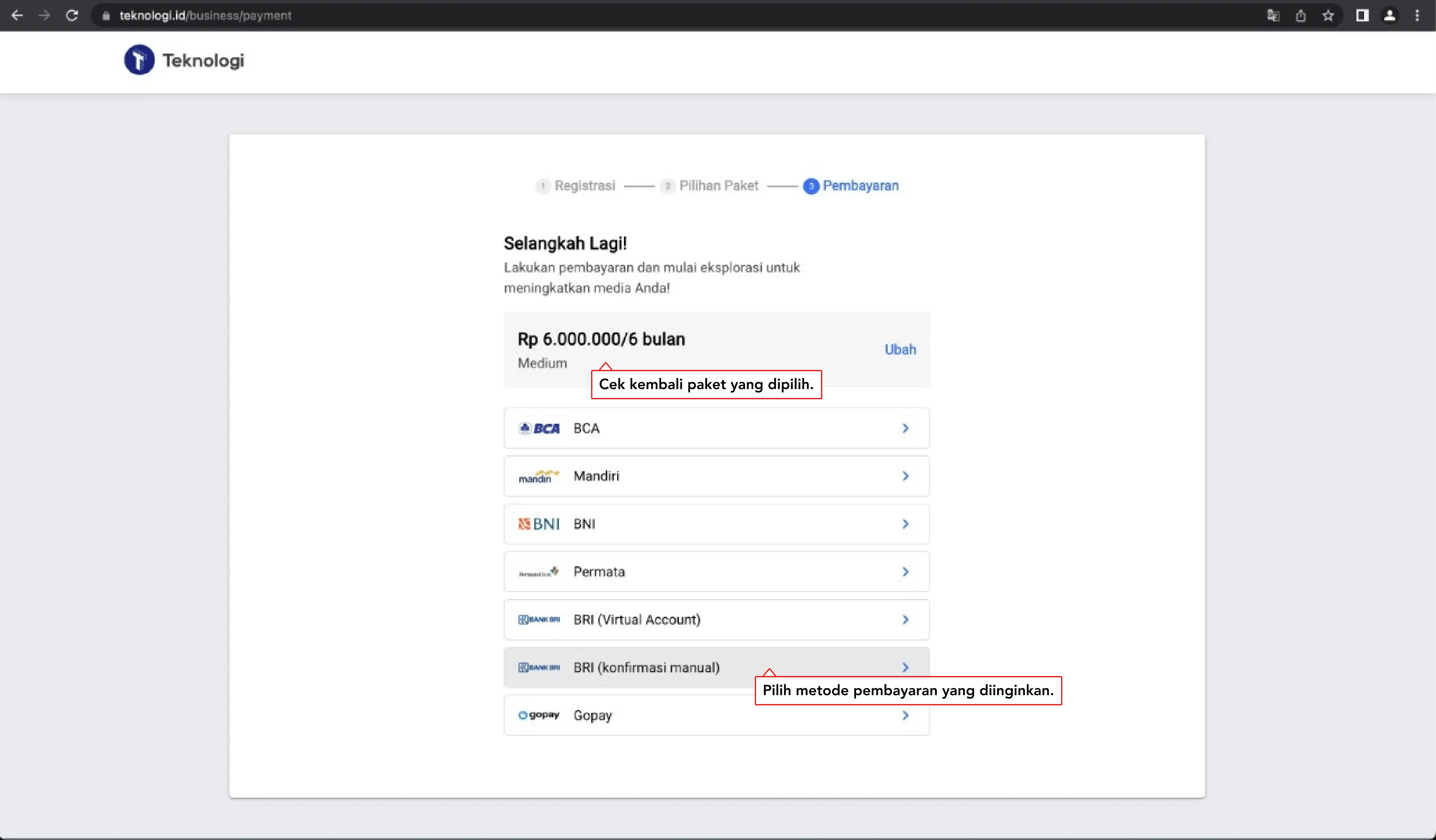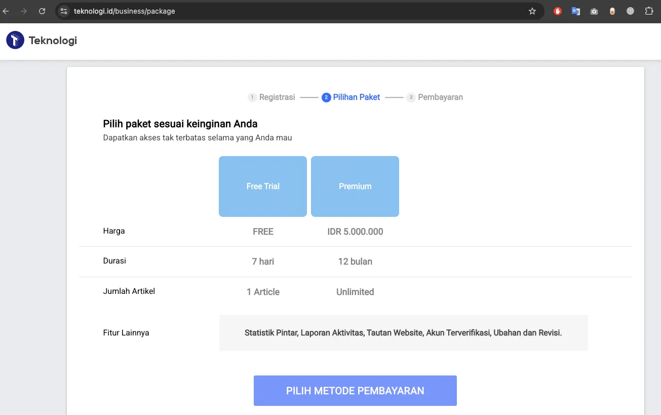 Langkah selanjutnya adalah memilih paket yang sesuai dengan kebutuhan bisnismu. Saat ini, Teknologi.id menyediakan dua pilihan paket yang dapat kamu gunakan untuk pengembangan bisnis: