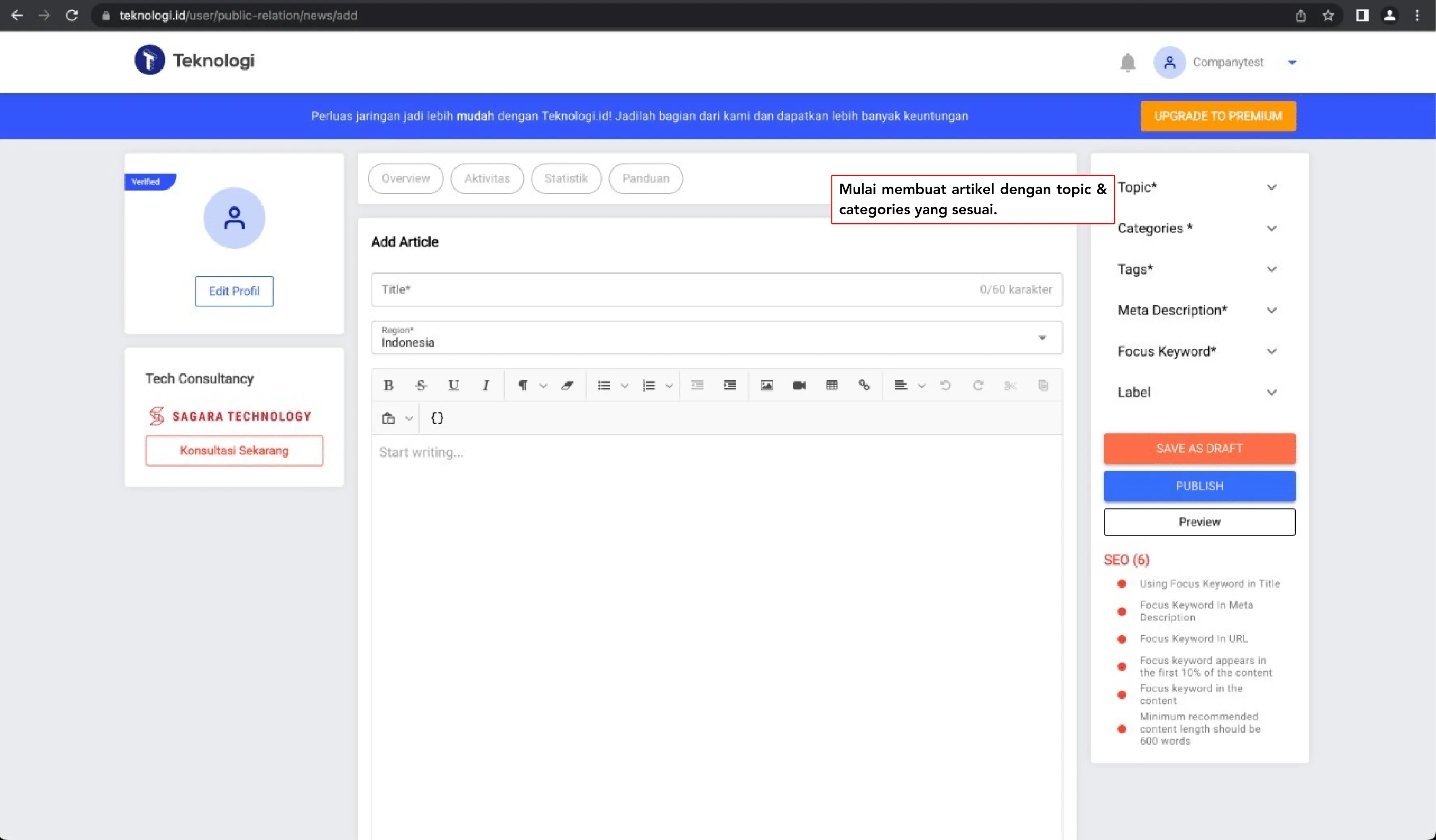 Setelah kamu melakukan pembayaran, kamu dapat mulai untuk memulai membuat artikel yang kamu inginkan. Ada beberapa menu bar di sisi kanan yang dapat menjadi indikator dan arahan kamu dalam menentukan arah dan jenis artikel yang akan kamu buat. Ada topik artikel, kategori artikel, tag, dan hal lainnya yang dapat membantu artikel kamu agar dapat menjangkau banyak viewers. Oiya, kamu juga bisa melihat analitik hasil dari artikel kamu di menu dashboard.
