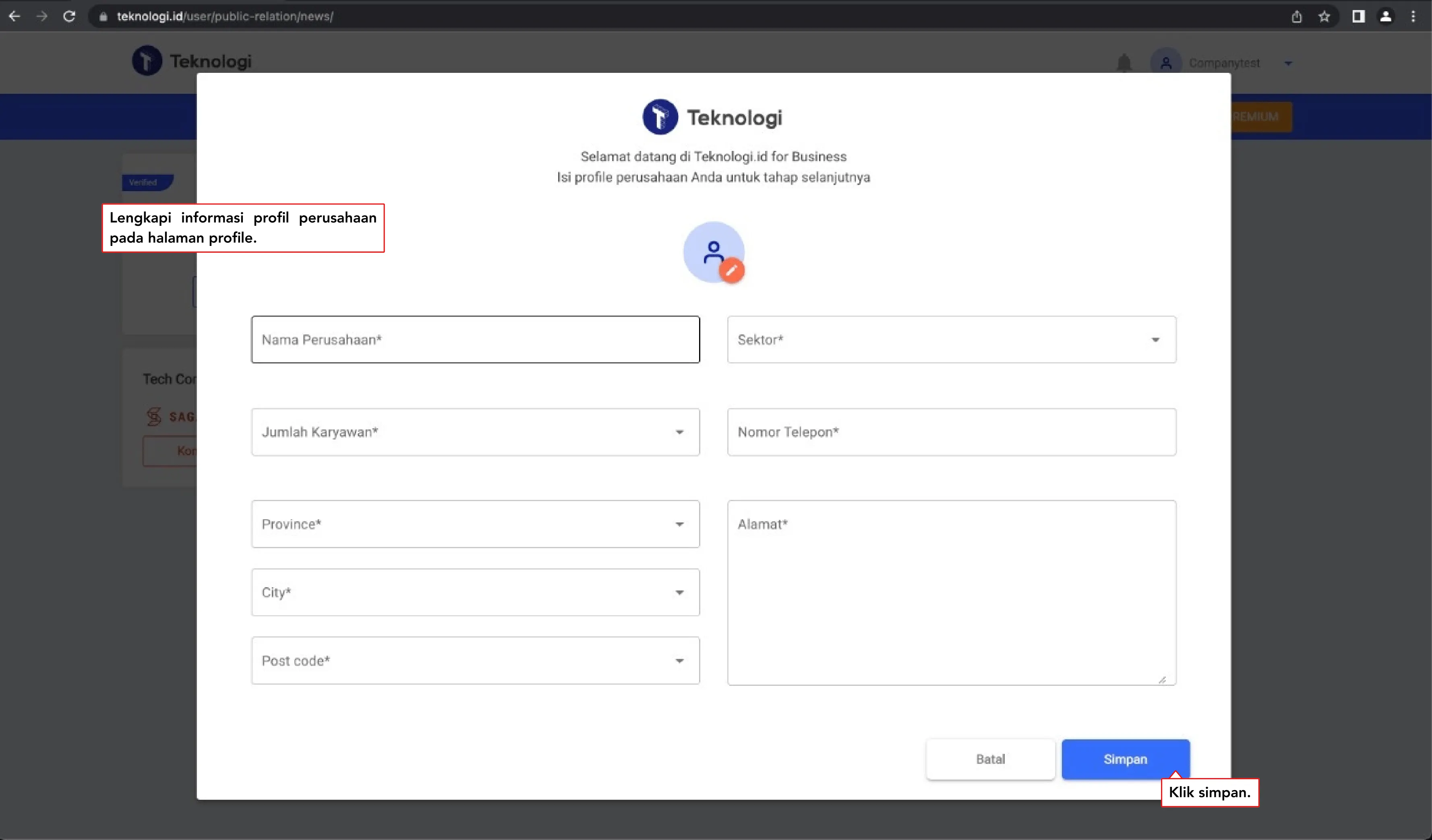 Sebagai media informasi bagi bisnis kamu di platform kami, alangkah baiknya kau melengkapi biodata bisnis kamu agar masyarakat dapat mengenali bisnis kamu dengan baik. Ada beberapa hal yang perlu kamu lengkapi agar biodata bisnis kamu bisa dikenali dengan baik oleh masyarakat. Data tersebut, di antaranya adalah foto profil, nama perusahaan, jumlah karyawan, sektor perusahaan, alamat lengkap perusahaan, dan data penting lainnya. Jika kamu sudah melengkapi biodata bisnis kamu, kamu sudah dapat menggunakan fitur kami dengan sepuasnya.