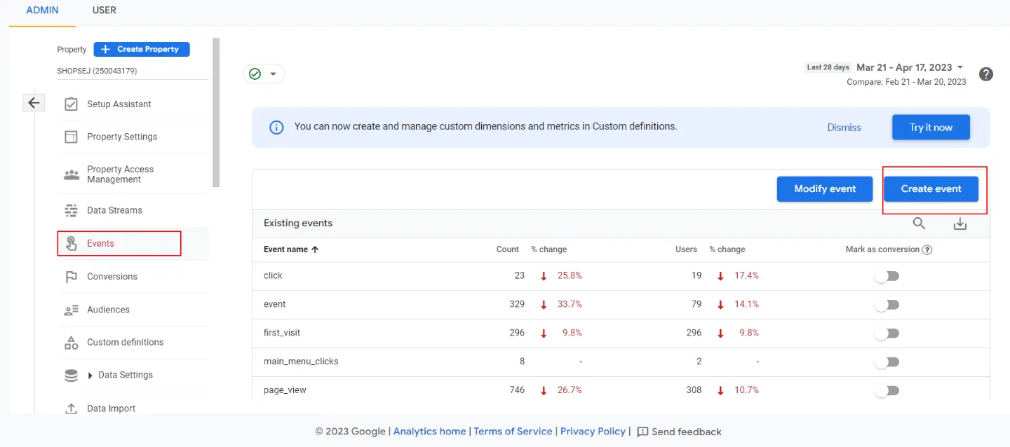 • Arahkan ke bagian Acara di GA4 dan klik tombol biru “Create Event” di sudut kanan atas.