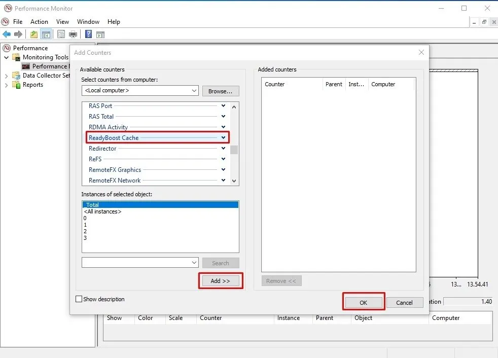 - Cari ReadyBoost Cache, lalu klik “Add>>” dan “OK”.