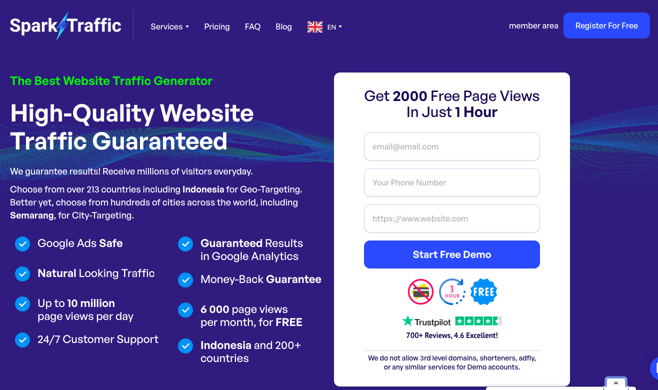 Anda dapat mencoba versi gratis untuk memperoleh 2.000 klik secara kilat. Uji traffic generator gratis ini untuk melihat seberapa berguna sparktraffic dan untuk mencoba antarmukanya.