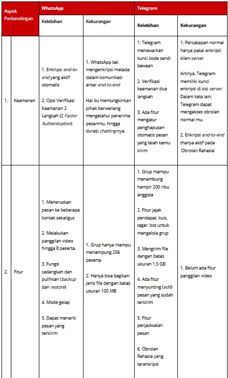 Berikut ini selengkapnya perbedaan WhatsApp dan Telegram dalam tabel perbandingan:
