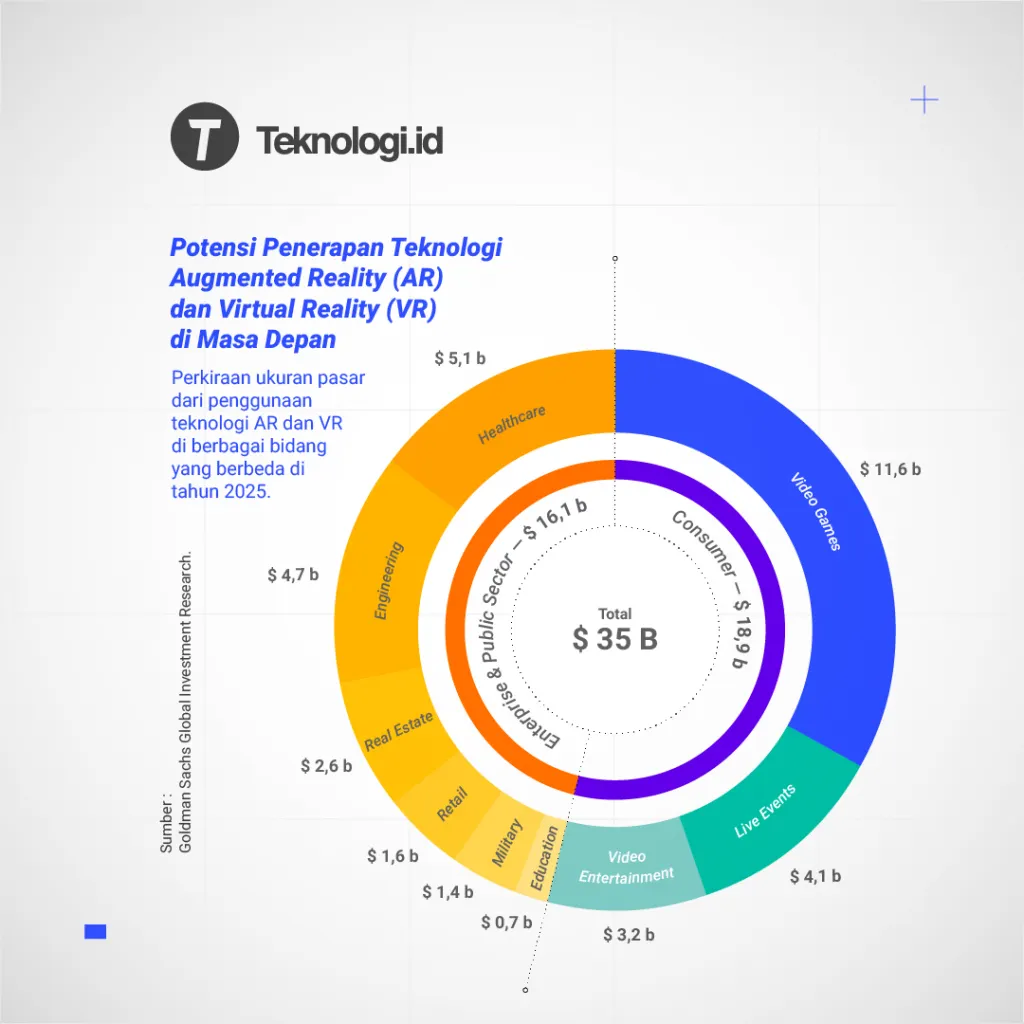 Dari diagram diatas diperlihatkan bahwa total ukuran pasar teknologi AR dan VR di tahun 2025 mencapai 35 miliar US Dollar dengan penggunaan yang lebih banyak dari sisi konsumen yatu video game. Sementara untuk sisi perusahaan dan sektor publik, penggunaan didominasi oleh bidang kesehatan dan engineering.