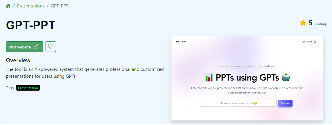 Presentations.AI merupakan platform yang menawarkan untuk membuat Power Point dengan cepat. Pengguna hanya perlu memberikan deskripsi topik yang ingin dibuat Power Point, maka Presentations.AI akan membuatnya. Bahkan Presentations.AI akan membuatkan materi presentasi Anda, bukan sekedar template. Namun, Anda juga bisa menyalin materi yang telah dibuat ke kolom yang disediakan. Presentations.AI akan membuatkan Power Point yang Anda butuhkan. Anda juga bisa mengunduh Power Point yang telah dibuat dan melakukan perbaikan sesuai keinginan Anda. Presentations.AI masih dalam versi beta dan menawarkan layanan pembuatan Power Point secara gratis, tapi dengan kuota yang terbatas.