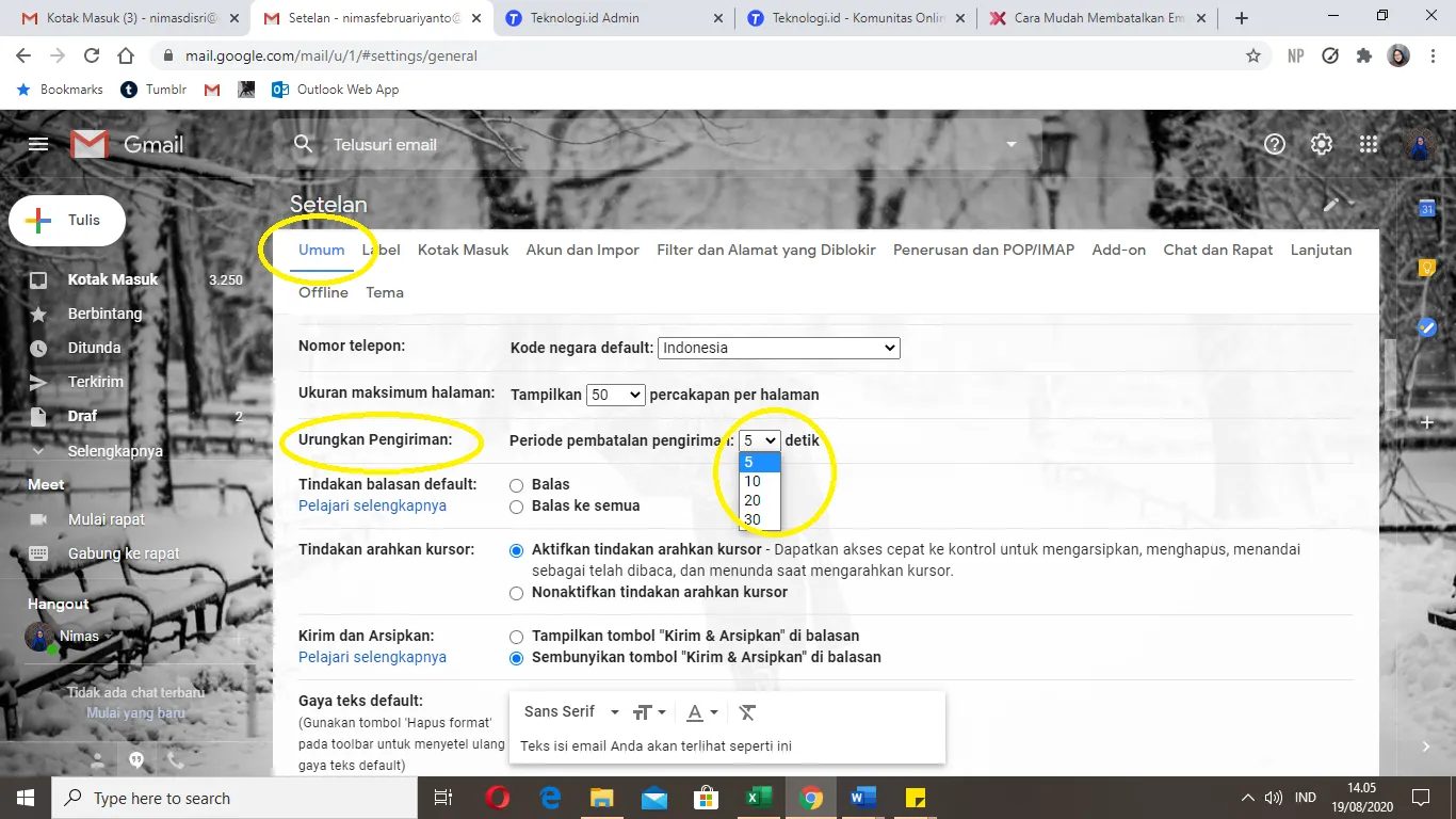 Klik Setelan (Settings) dan pilih Umum (General). Scroll tampilan layar hingga menemukan Urungkan Pengiriman (Undo Send). Di sana, kamu bisa menentukan periode pembatalan pengiriman, antara 5, 10, 20, atau 30 detik. Pilih sesuai kebutuhan dan pastikan telah menyimpan perubahan yang kamu buat dengan mengklik Simpan Perubahan (Save Changes).