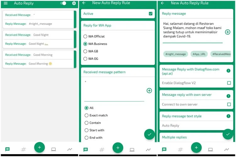 Contoh lain, memasukkan kata kunci (keyword) spesifik, seperti "Halo", dan memilih opsi "Exact match" untuk memicu balasan otomatis. Jika demikian, hanya pesan masuk berbunyi "Halo" saja yang akan dibalas secara otomatis.