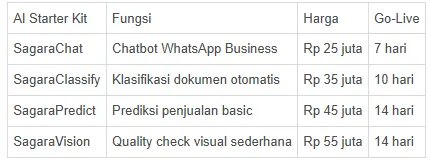 Untuk mencapai target ambisius ini, Sagara tidak hanya mengandalkan model customization penuh. Mereka juga mengembangkan AI Starter Kits — solusi AI pre-built yang bisa di-deploy lebih cepat dan lebih murah: