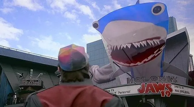 Menonton film di bioskop saat ini bisa dengan fitur 3D. Di mana kita seolah-olah melihat kejadian dalam film secara langsung dengan menggunakan kacamata 3D. Ada suatu adegan di mana Marty tercengang saat hologram 3D film “Jaws” seolah-olah akan memakannya pada papan iklan di atas gedung.