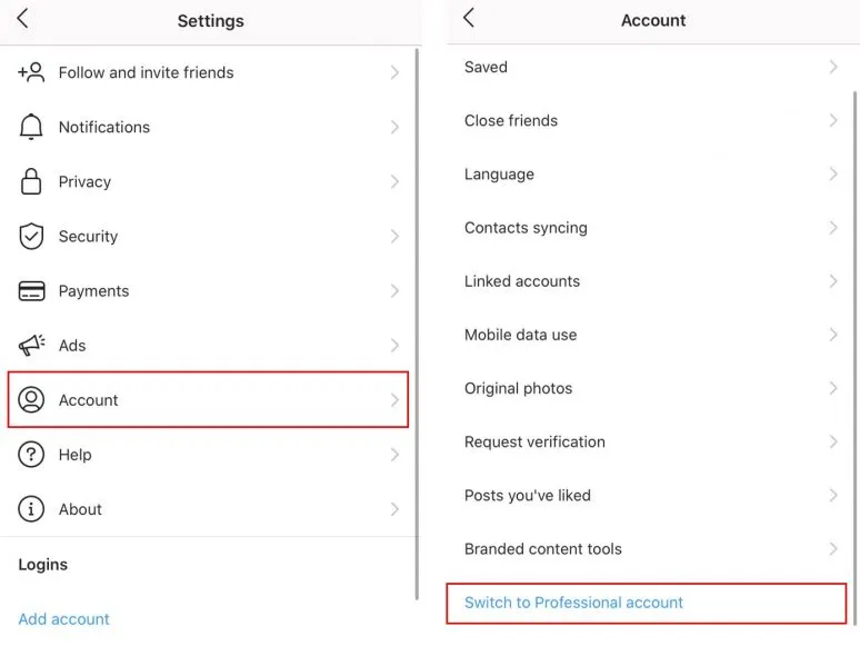 Setelah jendela Settings terbuka, pilih menu Account lalu klik Switch to Professional Account.