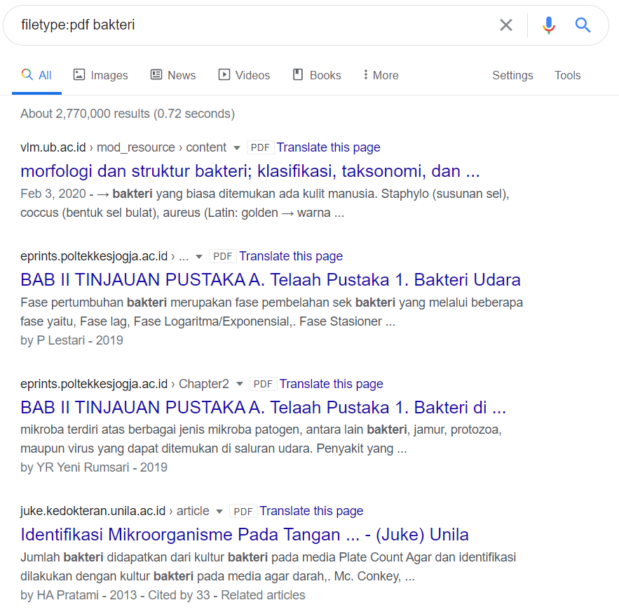 Untuk menampilkan hasil pencarian dengan format file tertentu, cukup ketikkan filetype: diikuti tipe filenya lalu judul file yang ingin dicari.