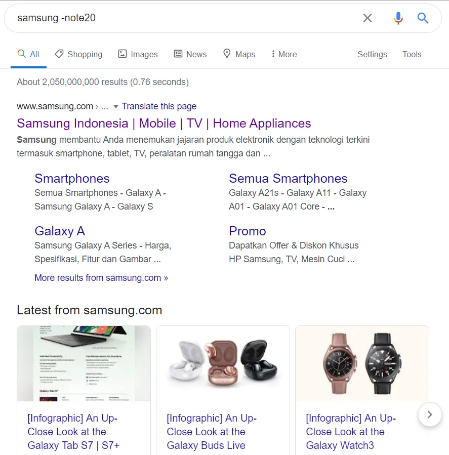 Ketika kamu ingin mencari sesuatu tanpa memuat kata lain, gunakan tanda minus. Fitur ini akan bermanfaat untuk mengeliminasi hasil pencarian yang tidak kamu butuhkan dan menaikkan hasil pencarian lain yang lebih kamu butuhkan.