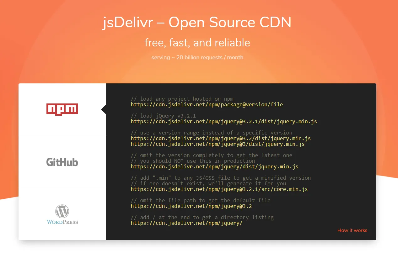 Tool ini memungkinkan pemrogram untuk melayani plugin WordPress atau file GitHub apa pun melalui CDN. Ini memungkinkan seseorang untuk menggabungkan beberapa file dalam satu URL dan untuk mendapatkan versi JS dan CSS yang diperkecil.