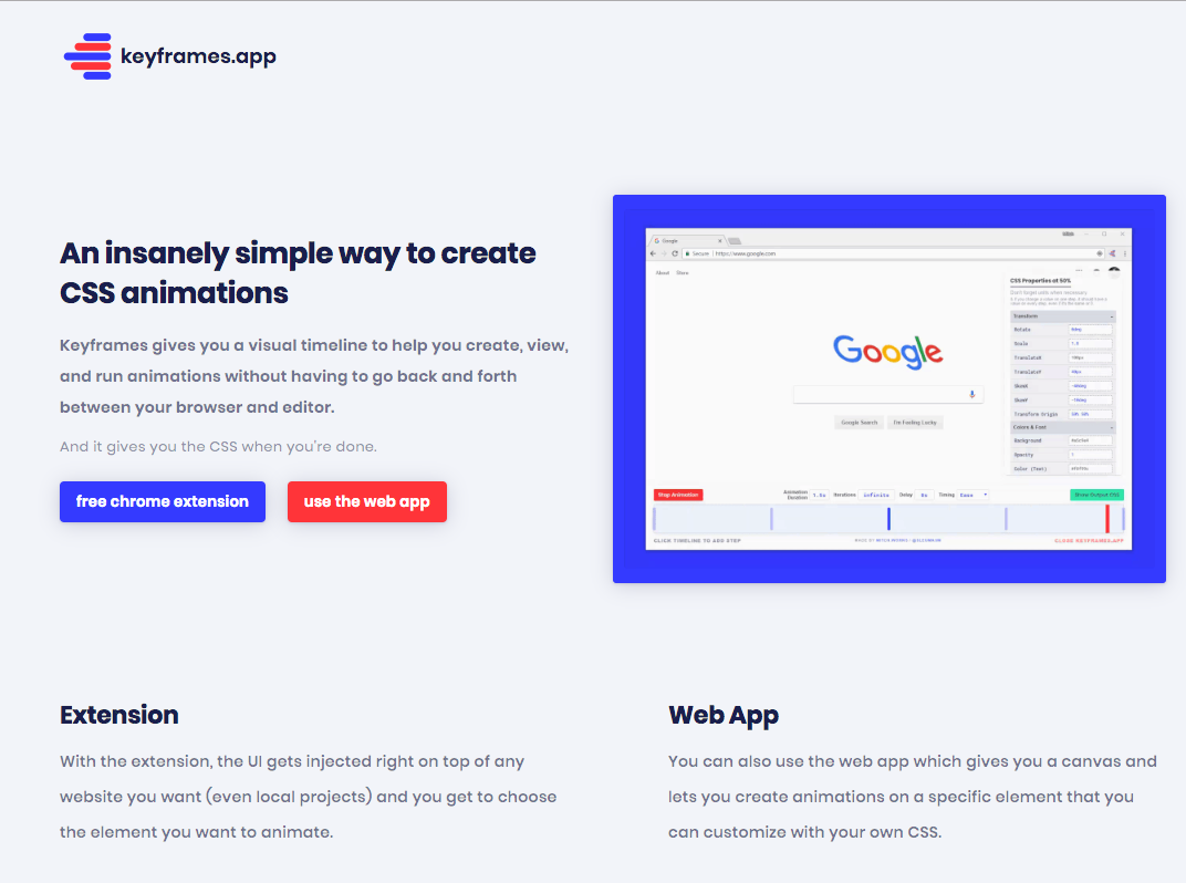 Aplikasi Keyframes adalah ekstensi chrome dan editor web yang memungkinkan kamu membuat, melihat, mengedit, dan menjalankan animasi CSS di dalam browser-mu tanpa harus bolak-balik antara browser dan editor. Sehingga tidak ada lagi celah antara browser dan editor.