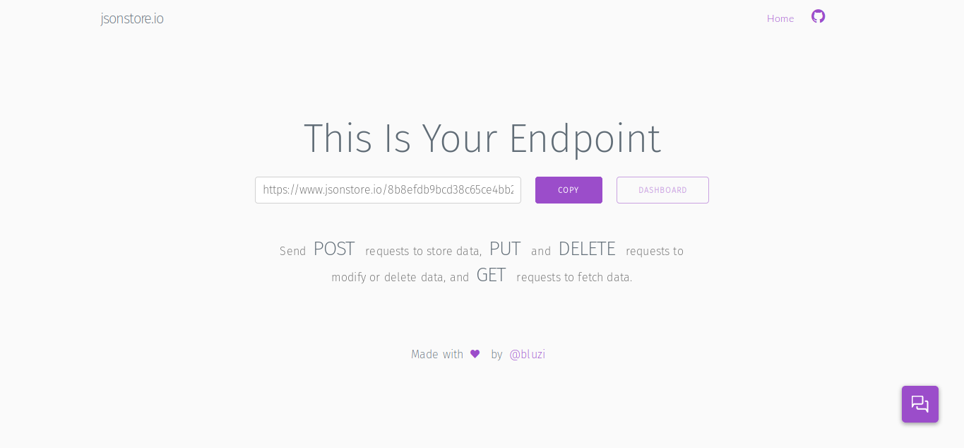 jsonstore.io adalah layanan web yang menawarkan penyimpanan data cloud berbasis JSON gratis, aman, dan untuk proyek-proyek kecil. Kunjungi situsnya, salin URL yang dihasilkan dan mulai kirim permintaan HTTP untuk berkomunikasi dengan penyimpanan data-mu.