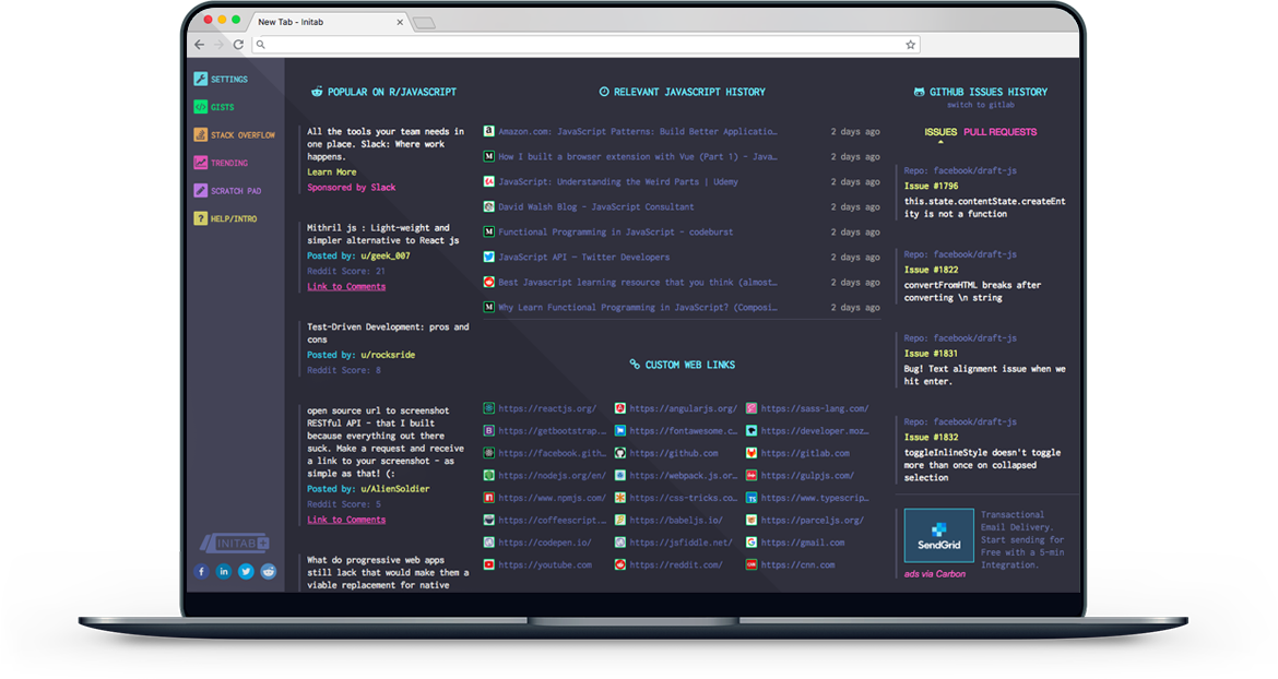 Initab adalah ekstensi tab baru chrome untuk pengembang yang menawarkan solusi untuk membuka terlalu banyak tab secara terus-menerus. Ini juga menawarkan beberapa alat yang berguna untuk menjadikan pekerjaan-mu sebagai pengembang lebih mudah dengan tampilan cepat aktivitas GitHub atau GitLab, aktivitas Stack Overflow, Gists, dan banyak lagi.