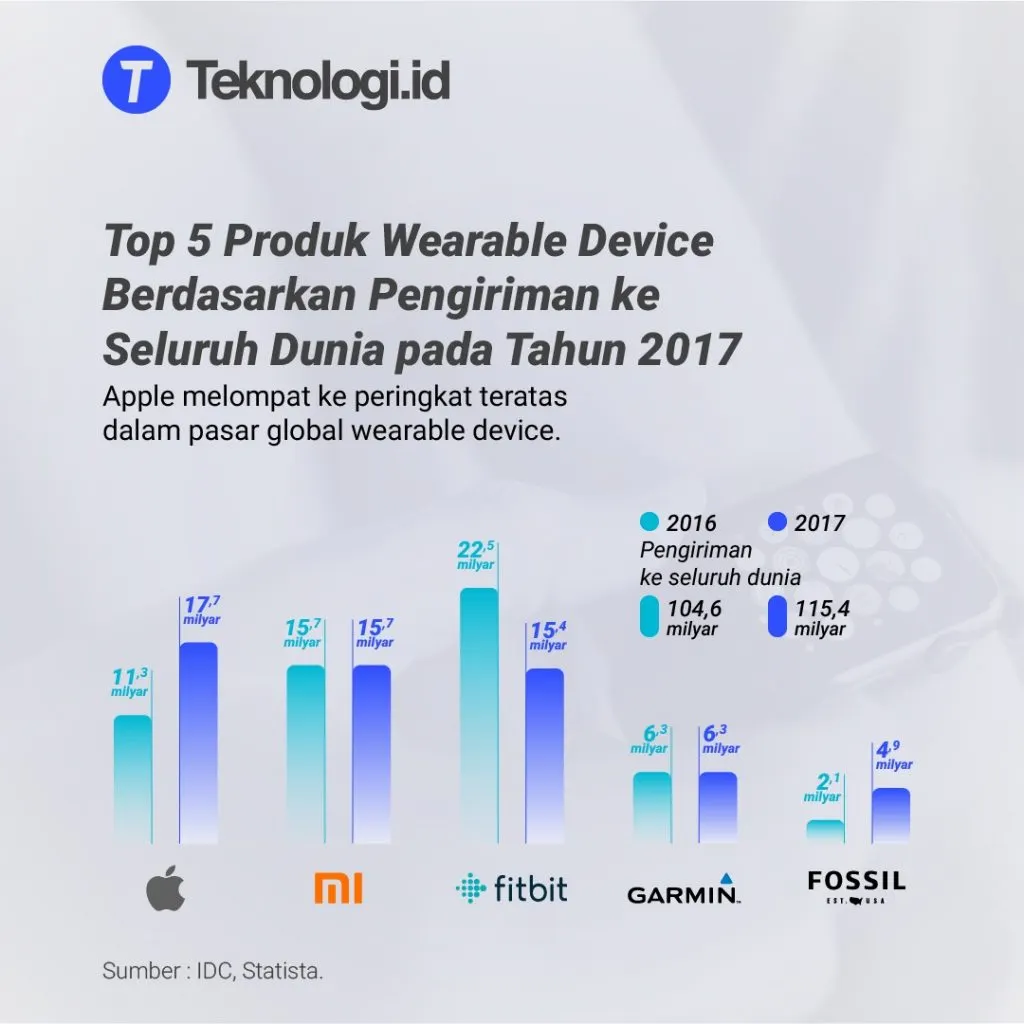 wearable devices terbesar tahun 2017, berkat kinerjanya yang kuat di kuartal liburan. Apple mengirim 17,7 juta jam pada tahun lalu, naik dari hanya 11,3 juta unit pada tahun 2016.