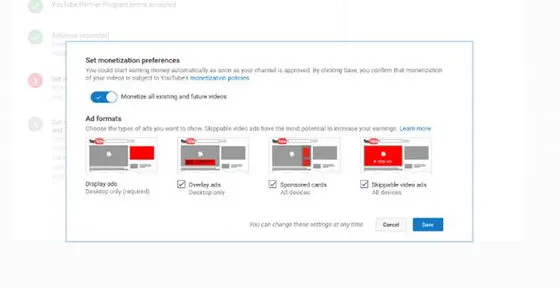 - Pilihlah jenis iklan yang sesuai dengan videomu. Jika ingin mengaktifkan semua iklan di semua videomu, aktifkan Monetize all existing and future videos. Klik Save untuk menyimpan pengaturan monetisasi.