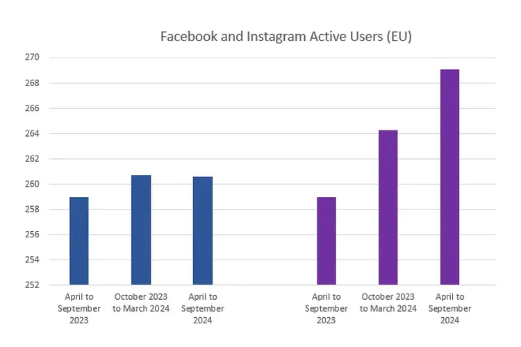 Social Media Today, dalam laporan yang dikutip oleh KompasTekno pada Kamis (7/11/2024), menyebutkan bahwa Facebook di Eropa menunjukkan tingkat pertumbuhan yang lebih lambat dibandingkan Instagram, bahkan mengalami sedikit penurunan dalam beberapa periode terakhir.